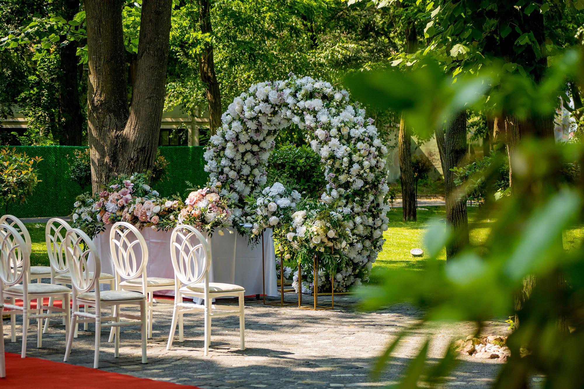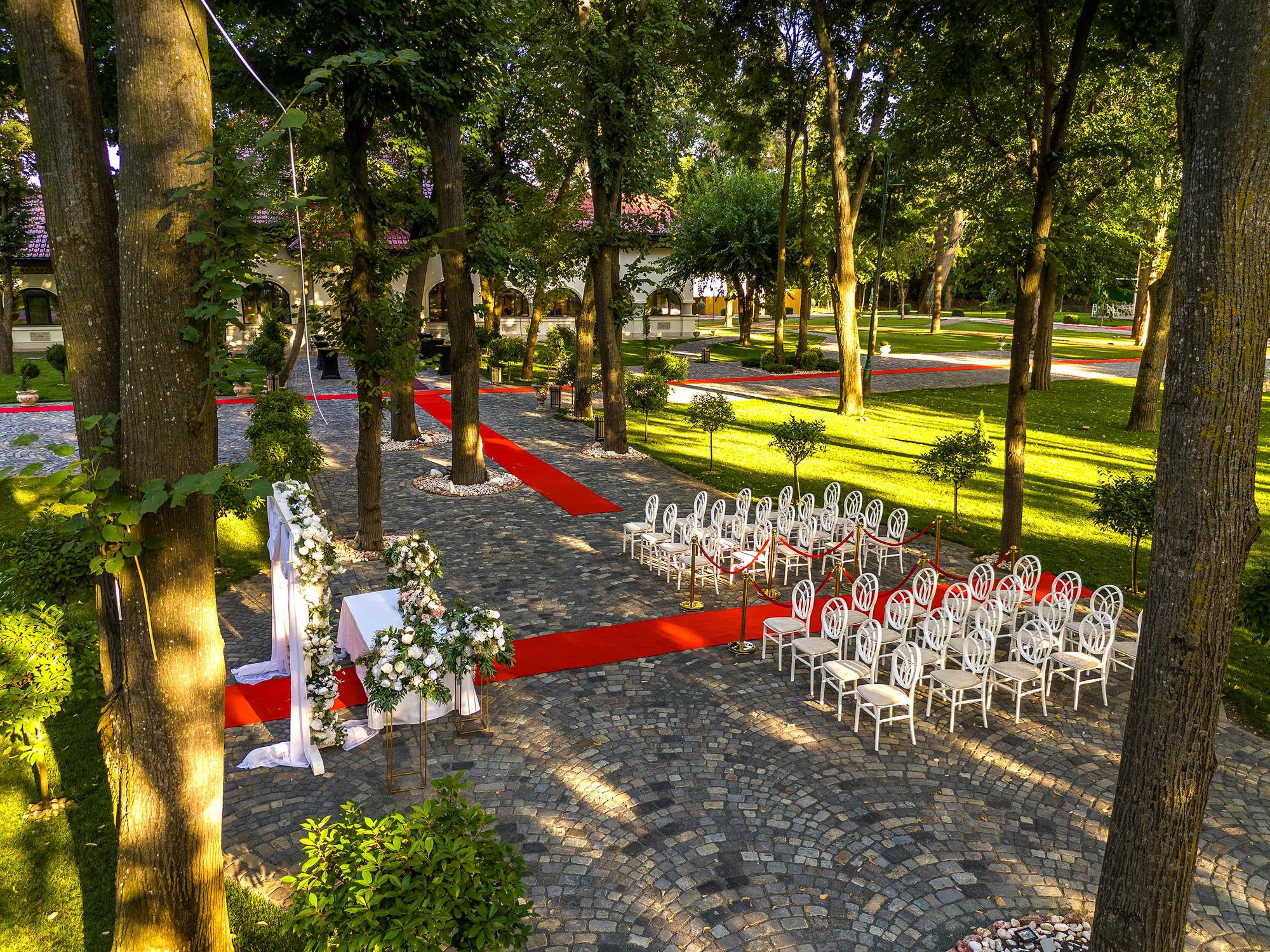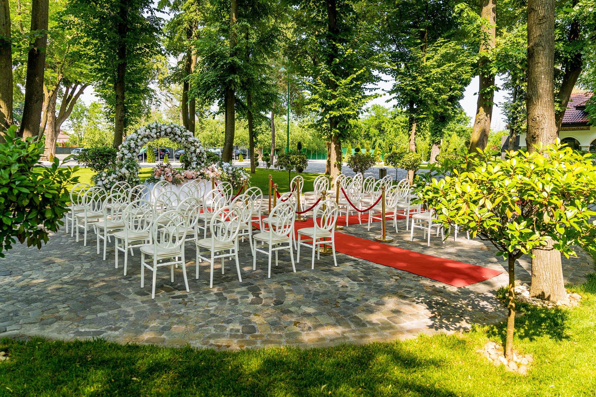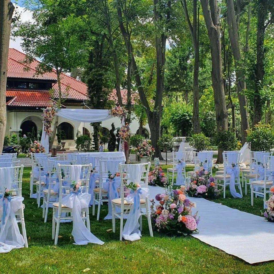 Sugestie: Rochiile vaporoase, florile de vară și un photo corner în umbra arborilor creează o atmosferă idilică. Recomandat pentru garden party-uri, petreceri ale burlacilor, baluri și majorate pentru adolescenți și tineri, aniversări, pool party-uri after wedding, botezuri sau cine festive la apus.