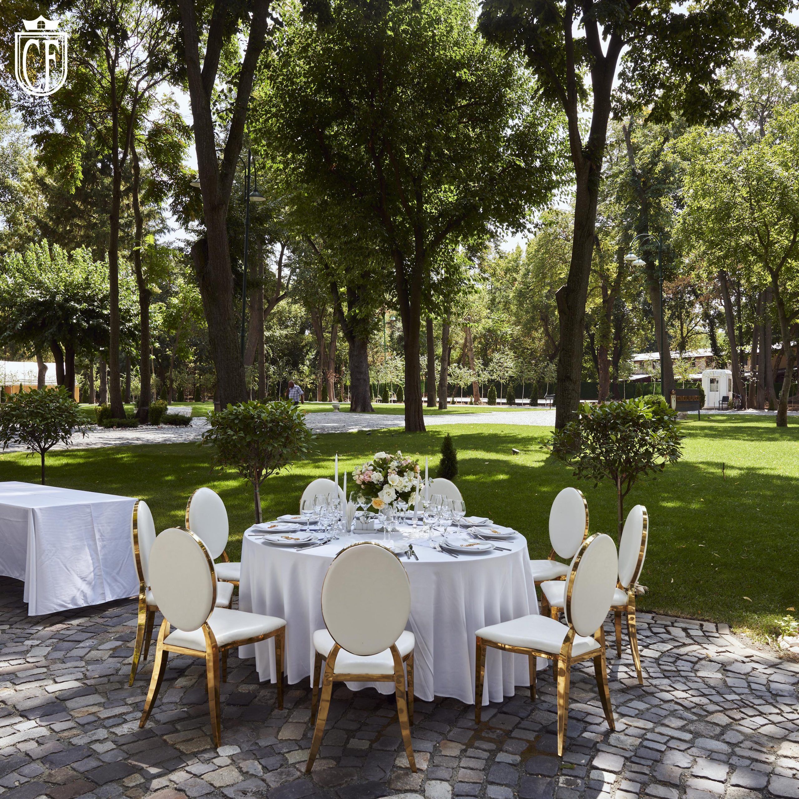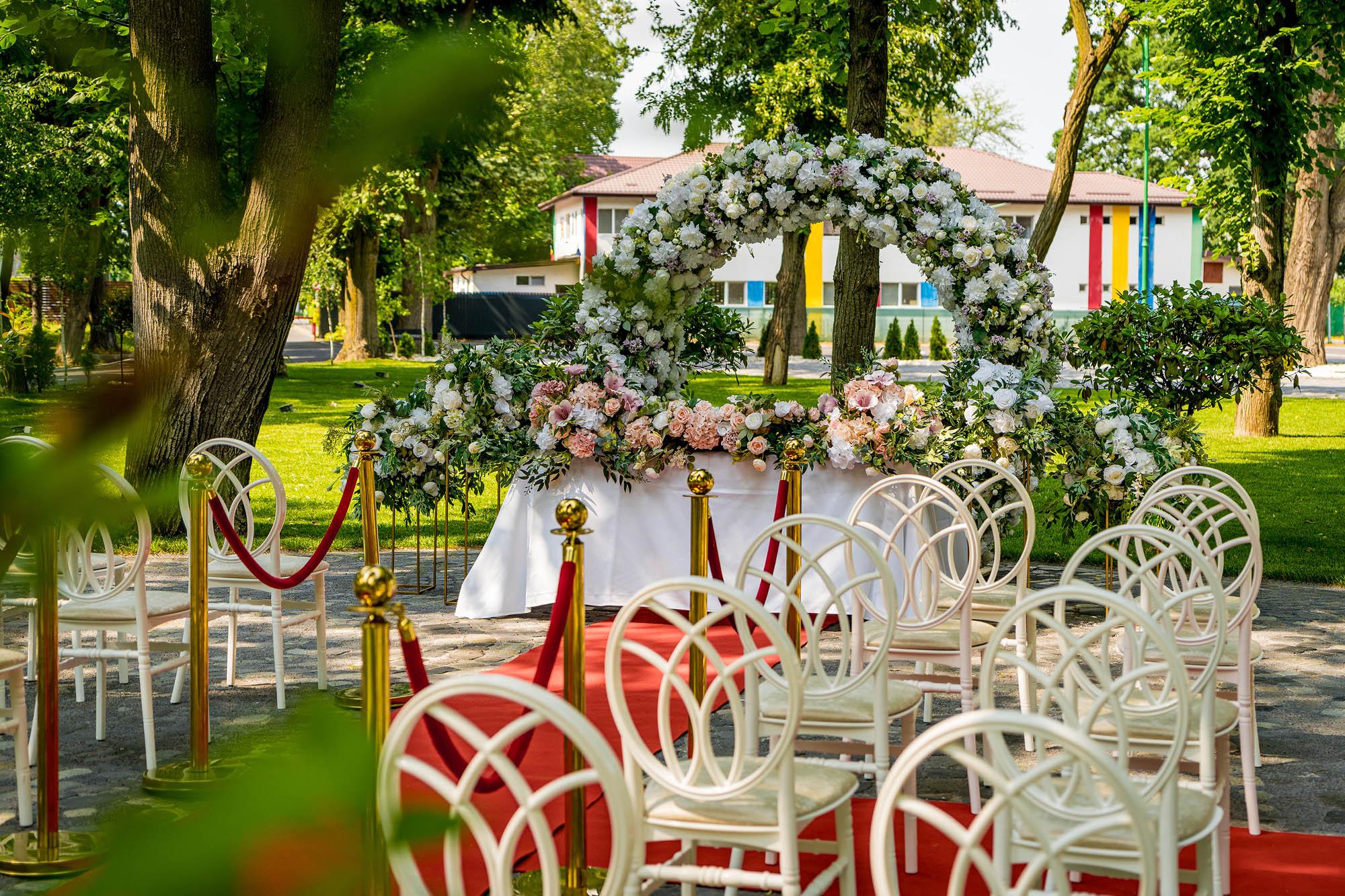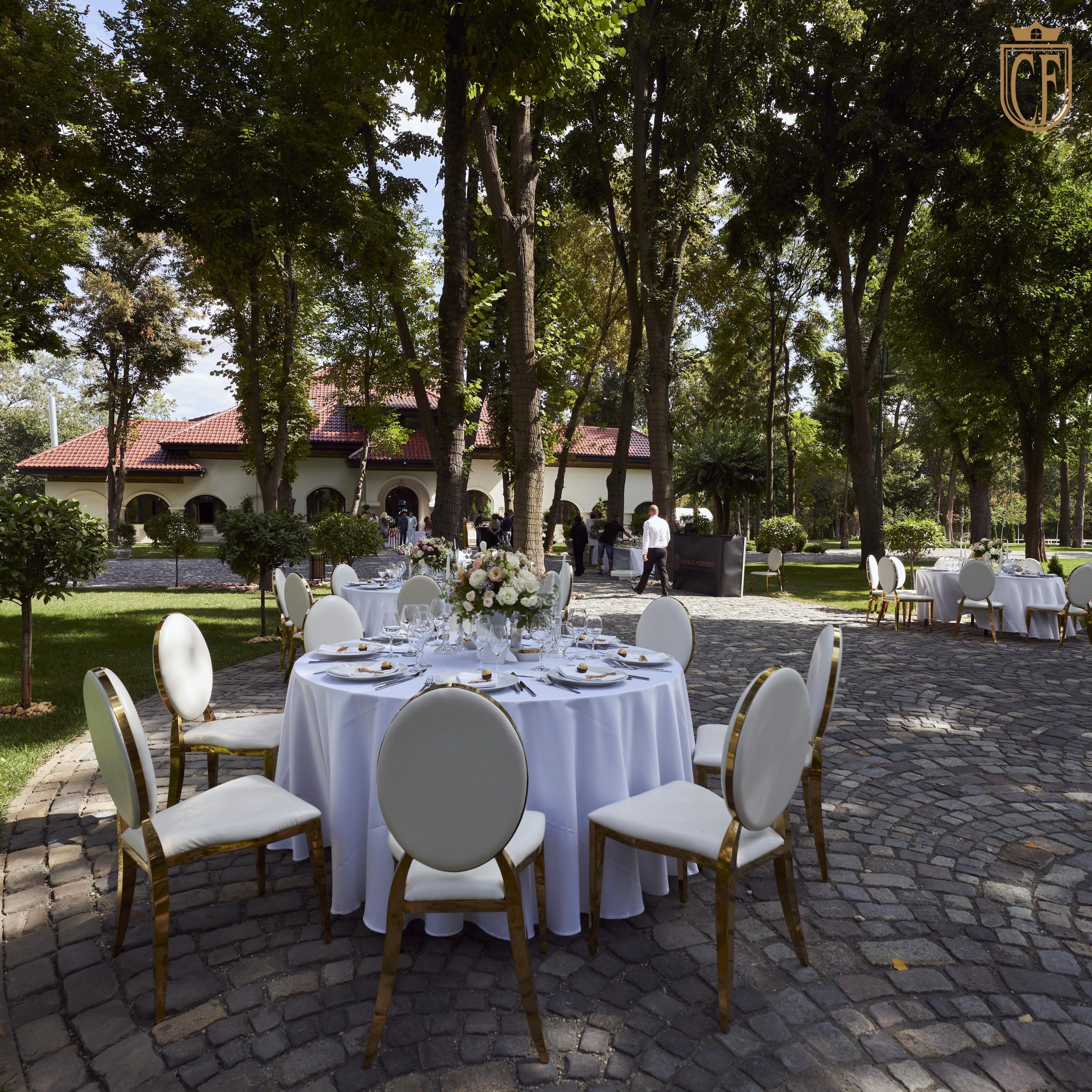 Sugestie: Rochiile vaporoase, florile de vară și un photo corner în umbra arborilor creează o atmosferă idilică. Recomandat pentru garden party-uri, petreceri ale burlacilor, baluri și majorate pentru adolescenți și tineri, aniversări, pool party-uri after wedding, botezuri sau cine festive la apus.